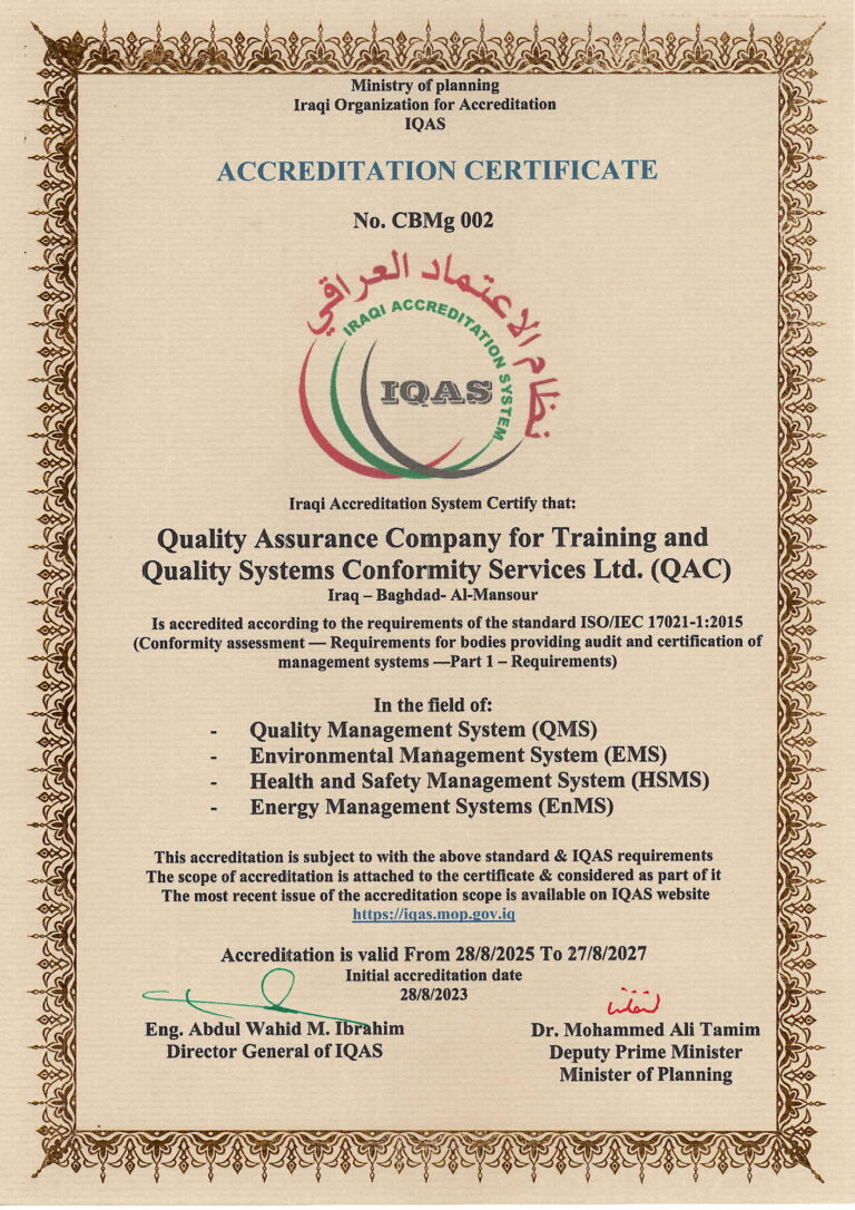 Quality Assurance Company for Training and Quality Systems Conformity Services (QAC) announces Obtaining an accreditation certificate No. CBMg 002 from the Ministry of planning Iraqi Organization for Accreditation (IQAS) in management system from 2023. QAC is consisting of highly experienced professionals offering the latest in systems certification and promoting quality concepts. This issue guarantee professional level of work and approach. QAC certification is expanding its operations very fast.